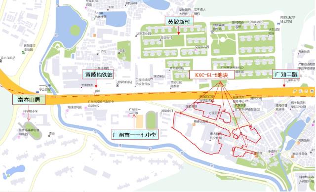 黄埔区广汕公路以南、开创大道以西KXC-G1-5和KXC-G1-6地块位于黄埔区广汕公路以南、开创大道以西;距地铁6号线黄陂站、广汕二路较近,周边有雅居乐富春山居、龙光峰景华庭、万科新里程等住宅小区,附近有广州市一一七中学等服务设施。