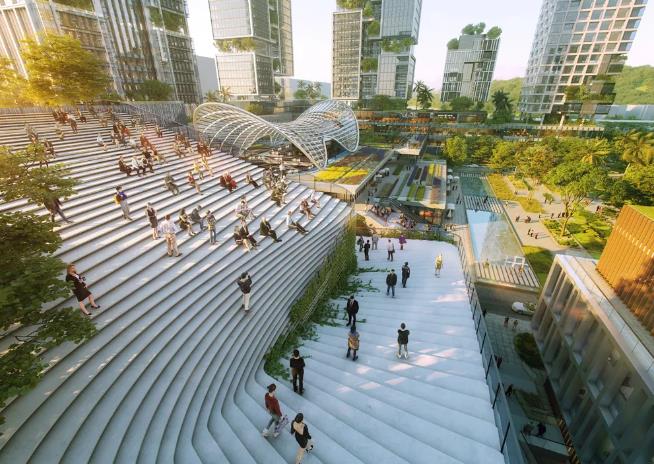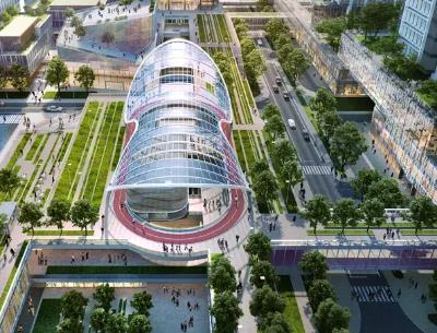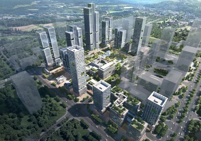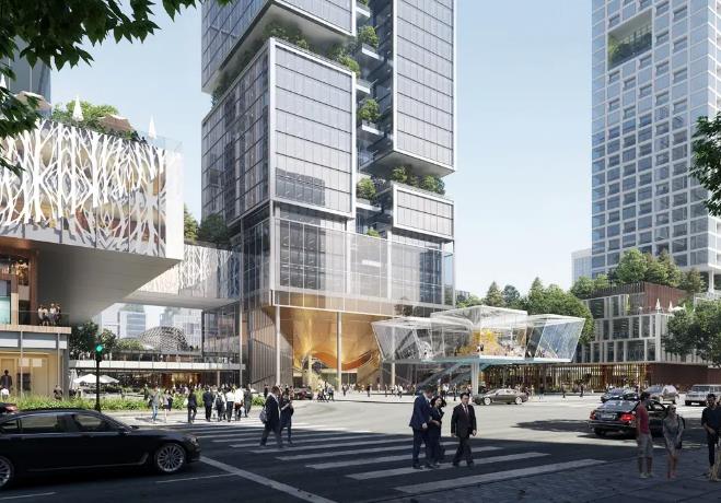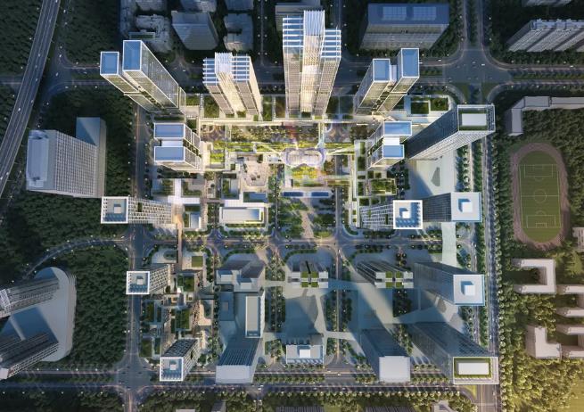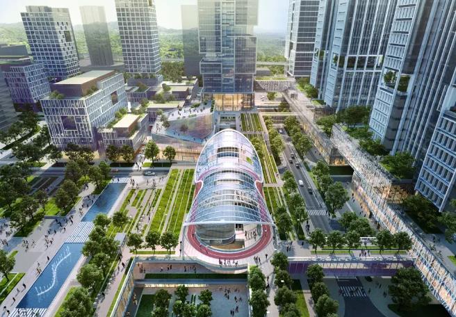 项目集办公、商业、公寓等功能于一体,设计打破传统布局形式,以城市地铁接驳口为出发点打造城市驱动器,通过与城市功能巧妙融合,增强站城聚变的人性体验,实现站城一体化。并以“城市雕塑”为概念,将五个各具特色的亮点建筑自地铁站由东向西依次排布,构建片区主轴线,环绕以多维连接的城市绿轴及中央绿化公园,通过下沉广场、底层架空、多层连廊等构建多维立体慢行系统,提供24小时连续的绿色公共空间体验。