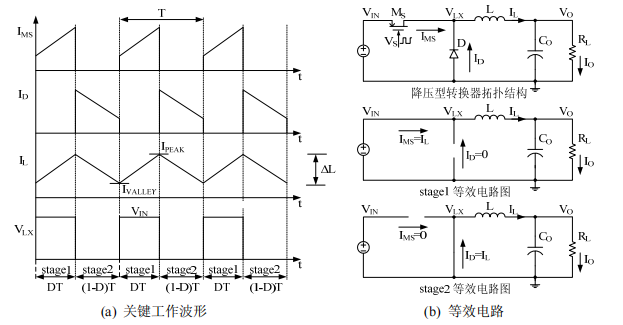 图1.2降压型DC-DC转换器连续工作模式下等效电路及关键工作波形