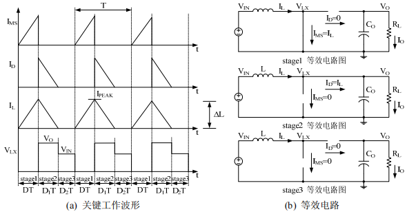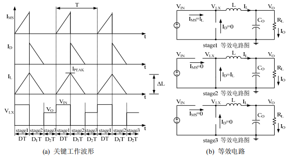图1.5升压型DC-DC转换器非连续工作模式下等效电路及关键工作波形