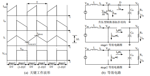 图1.4升压型DC-DC转换器连续工作模式下等效电路及关键工作波形