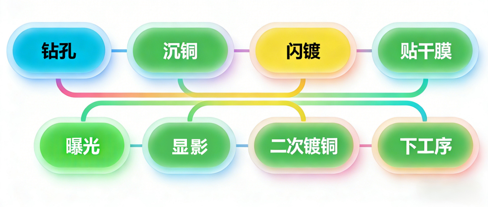 FPC制造中的闪镀工艺是一系列精密操作的集合。整个过程从钻孔开始,在柔性基材上创建电路连接的通路。接着是沉铜工序,通过化学方法在孔壁沉积一层薄铜,为后续电镀建立导电基础。