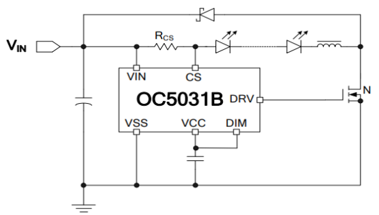 OC5031B是我司设计的一款高耐压60V,输出电流5A,外置功率MOSFET,电感连续导通工作模式的降压LED恒流驱动器