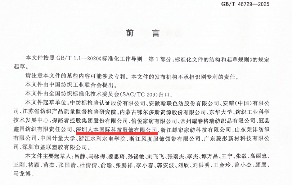 近日,《GB/T 46729—2025 纺织品 智能纺织品术语和分类》国家标准正式发布,将于2026年5月1日起实施。深圳人本国际科技服饰有限公司作为该标准的核心起草单位之一,与安踏(中国)有限公司、东华大学等多家行业领军企业及科研机构共同参与了标准的制定工作,彰显了公司在智能服饰领域的技术实力与行业影响力。