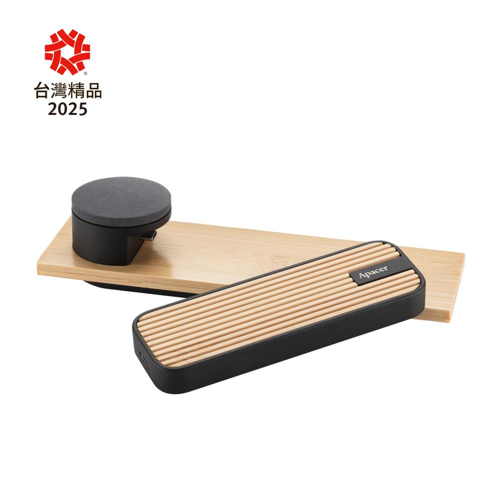 产品采用了独特的环保理念和材料选择。主体采用天然孟宗竹与铝合金材质打造,每一块竹材都拥有独一无二的纹理和色调。更值得一提的是,产品配套的底座由铝合金、再生塑料、天然竹材以及水库淤泥制成,体现了宇瞻在可持续发展方面的承诺。