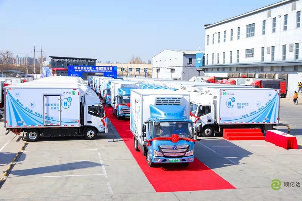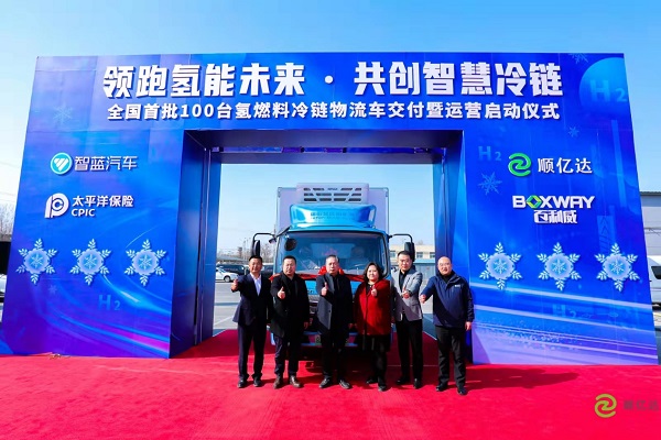 2022年3月3日,全国首批100台智蓝氢燃料冷藏车交付北京顺亿达,在北京大兴百利威物流园举行交付暨运营启动仪式。大兴区交通局、大兴区经信局、大兴区黄村镇等相关领导、顺亿达、百利威、智蓝汽车、太平洋保险等企业代表,以及氢能、冷链、物流等行业协会领导、广大客户领导、各大协作单位领导,与数十家全国媒体共同见证首批车辆装车发运,全国首个最大批量100台氢燃料冷藏车正式投入运营,全面展示了首都落实国家氢能发展战略的实力和行动,以顺亿达、百利威、智蓝汽车为代表北京市属企业先行先试、深度链合,实现产业科技智慧运营应用落地,助力京津冀能源结构转型。