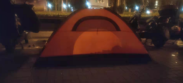 疫情封控的情况下,顺丰同城的骑士们出小区后便不能再回小区,很多骑士都随身携带帐篷、睡袋,在凌晨1-2点结束一天的配送任务后,就近找个非机动车道停车处或者桥洞里休息。