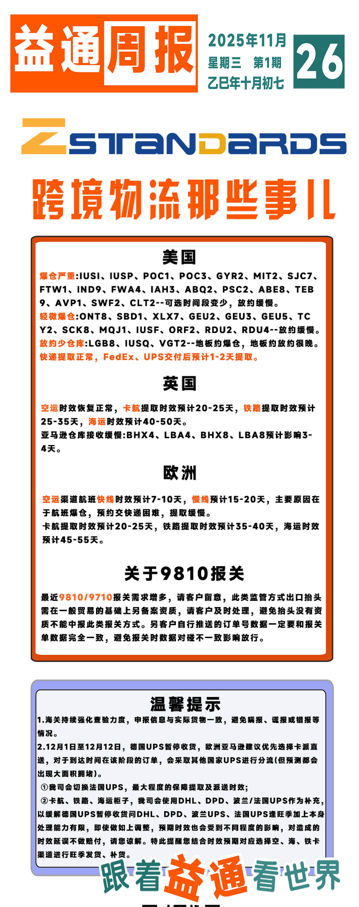 空运时效恢复正常,卡航提取时效预计20-25天,铁路提取时效预计25-35天,海运时效预计40-50天。亚马逊仓库接收缓慢:BHX4、LBA4、BHX8、LBA8预计影响34天。